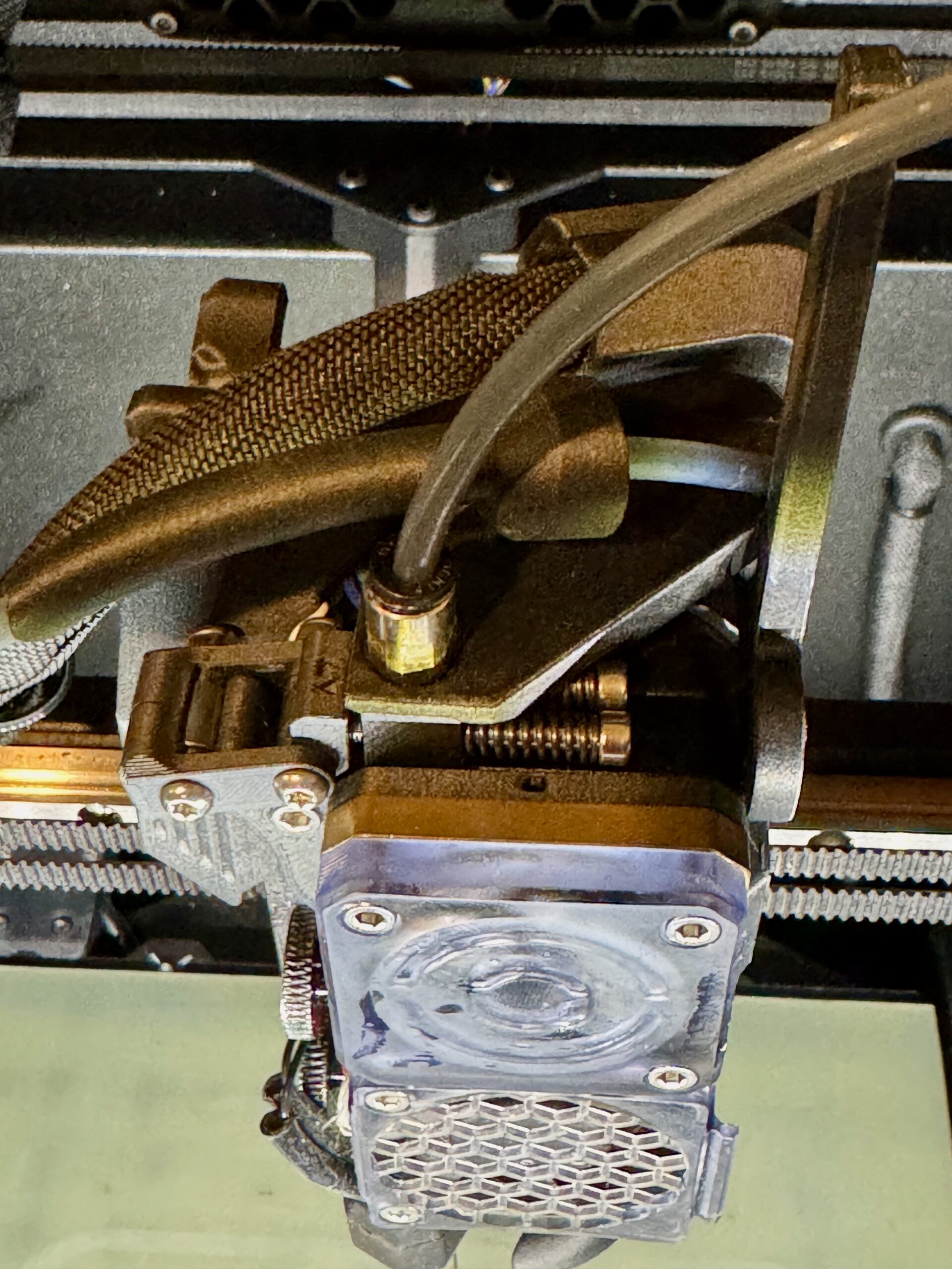 Of all the filaments I own, this one seems to be the most challenging... not to print, but to load. It's extremely stiff and brittle and I ended it snapping it several times trying to get it past the Bowden bend and into the Nextruder. Once I got it past the filament sensor I could not get it past the extruder gear into the nozzle. This is because I'm using a bogie mod that is optimized for flex materials. So I finally managed to get it to feed in by snaking a separate Bowden tube from my dry box going underneath the top (see pic below). There is a one pulley Bogie mod on Printables made for specifically for this and ASA/ABS-CF but turns out I didn't need it.