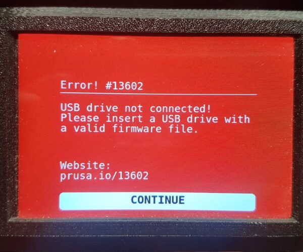 My first post and I think a difficult one. I have a pre-assembled Mk4 from july 2023. Since a couple of weeks the LCD display doesn't lite up after power up. Wiggling the flat ribbon cable and disconnecting and reconnecting the red connector on the back of the LCD and that helped some times. Yesterday however during flashing the firmware (USB stick inserted and powered up) the display went blank again making flashing impossible. so tried reset, switched off and on again, removed USB, reconnected USB etc. but to no luck. Display remained blank. removed the flat ribbon cable completely and reconnected it and wired it outside the frame away from the motor cables. Now display is showing again. BUT.... Now the display shows error code #13608
