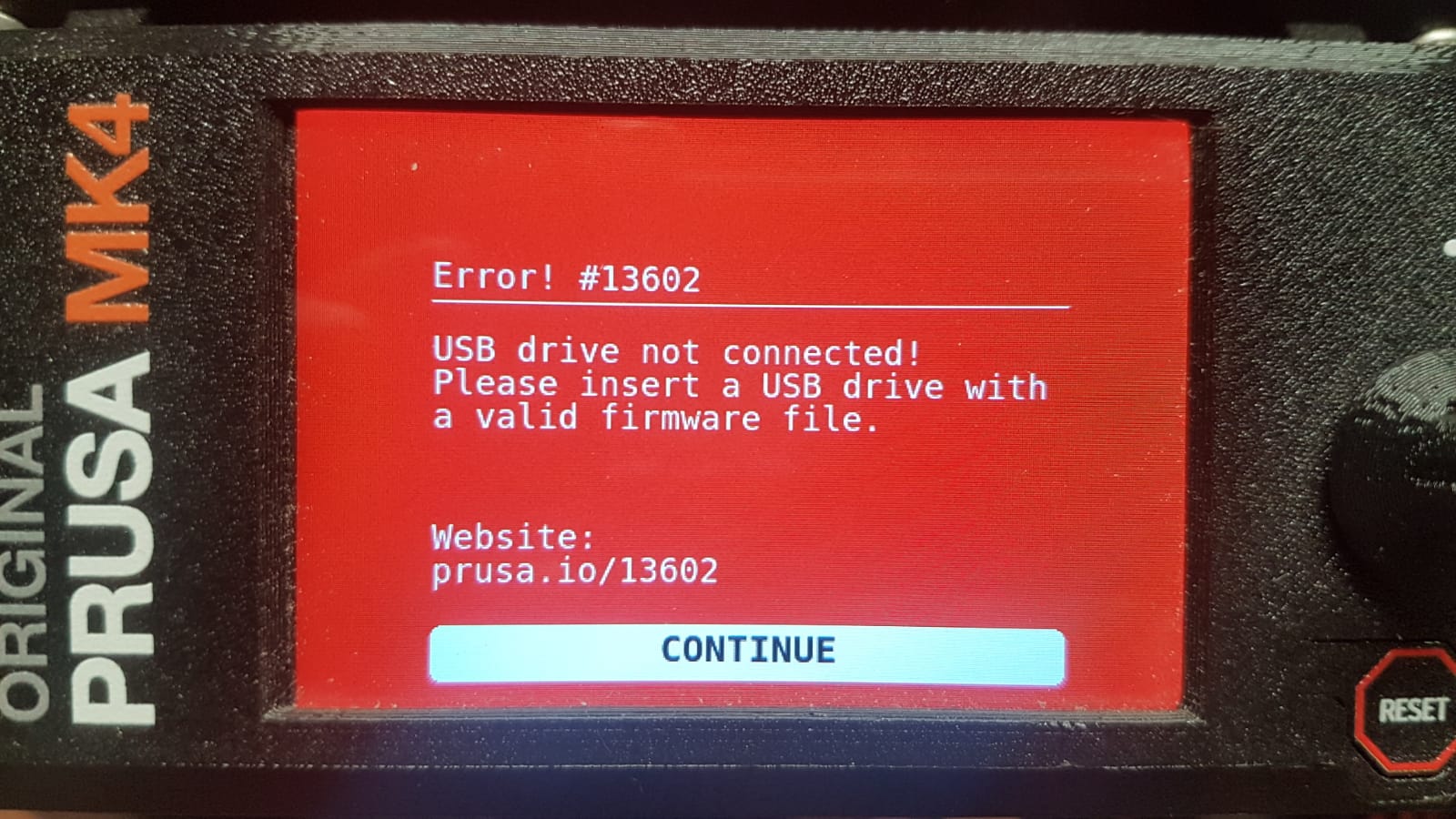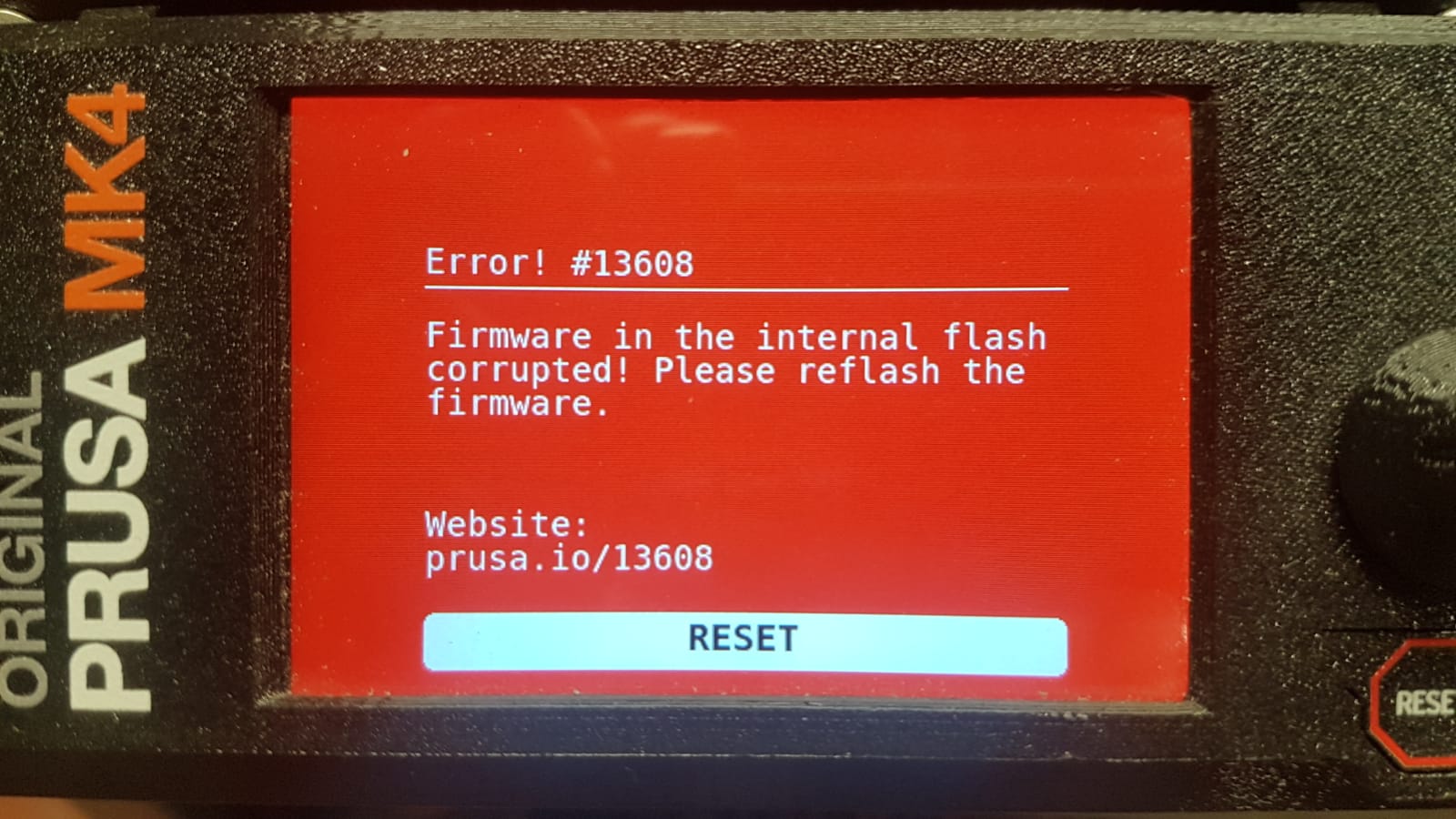My first post and I think a difficult one. I have a pre-assembled Mk4 from july 2023. Since a couple of weeks the LCD display doesn't lite up after power up. Wiggling the flat ribbon cable and disconnecting and reconnecting the red connector on the back of the LCD and that helped some times. Yesterday however during flashing the firmware (USB stick inserted and powered up) the display went blank again making flashing impossible. so tried reset, switched off and on again, removed USB, reconnected USB etc. but to no luck. Display remained blank. removed the flat ribbon cable completely and reconnected it and wired it outside the frame away from the motor cables. Now display is showing again. BUT.... Now the display shows error code #13608