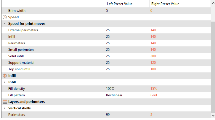 I then did a second attempt (the one in the pictures) with the same changes over the default 0.10 fast detail profile (enable brim, infill 100% and rectilinear infill) plus setting perimeters to 99 and decreasing speeds to 25mm, here is a picture of the comparison with the default.