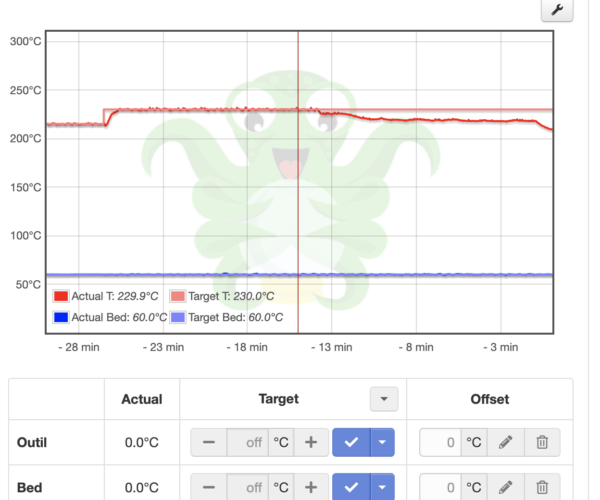 I've recently replaced thermistor and heater cartridge of my mk3s printer. since then, I am experiencing thermal runaway error. it happens each time ( 5 attempts up to now) at the start of the layer 4, when the printer fan is at 100%. the screenshot shows the problem. the first two layers are ok ( 215 and 230 degrees), during the third layer, the printer temperature is around 219 degrees to decrease down to 213 degrees as soon as the fan is 100% speed.