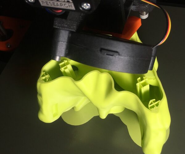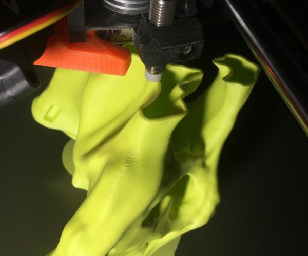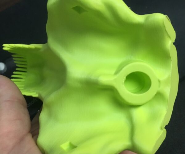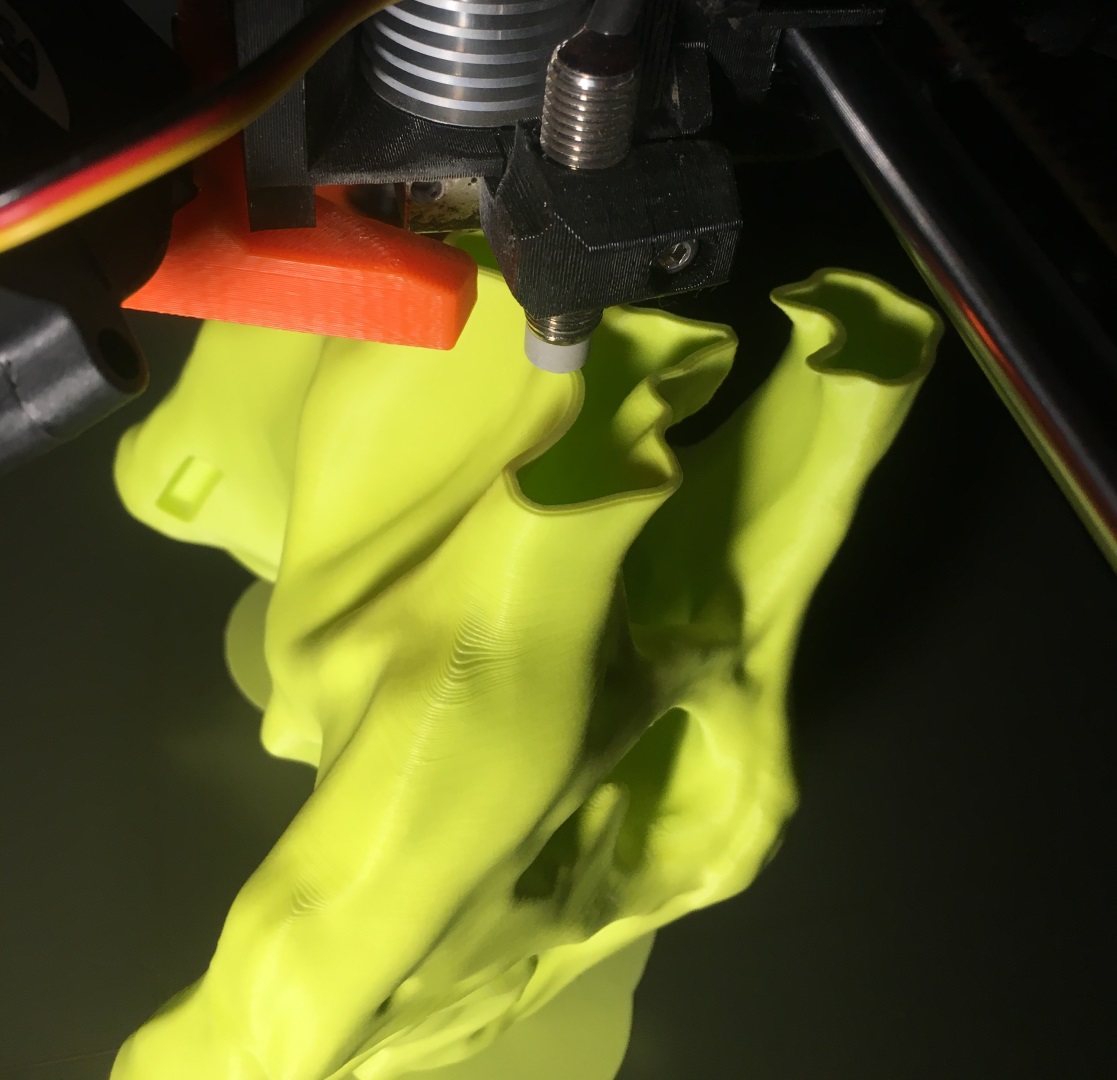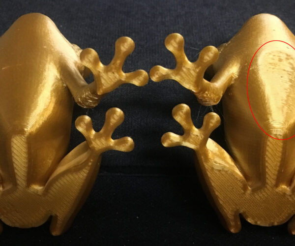The over hang on this tree frog model is curling upwards as it prints, it's very thin and flat and the nozzle passes over it many times trying to " ensured vertical shell thickness" in this case it's necessary to do so, however this silk filament (PLA) doesn't respond well to this situation at the temperature I might normally print this Frog (215C) the problem is solved in this case by turning the temperature up 5C to 220C and the problem goes away. (if this was Hatchbox brand I would have printed it at 205C) this can also be accomplished in some cases by reducing the fan speed for a part of the model or re orienting the models position to the fan, or even using a different filament. you will have to experiment with your specific model and filament to get it right. There are many possible fixes to this problem others may include, slowing the print down, turning off "ensured vertical shell thickness" <-- although slicer will still try, it changes the results, and changing the infill type and density can have an effect as well.