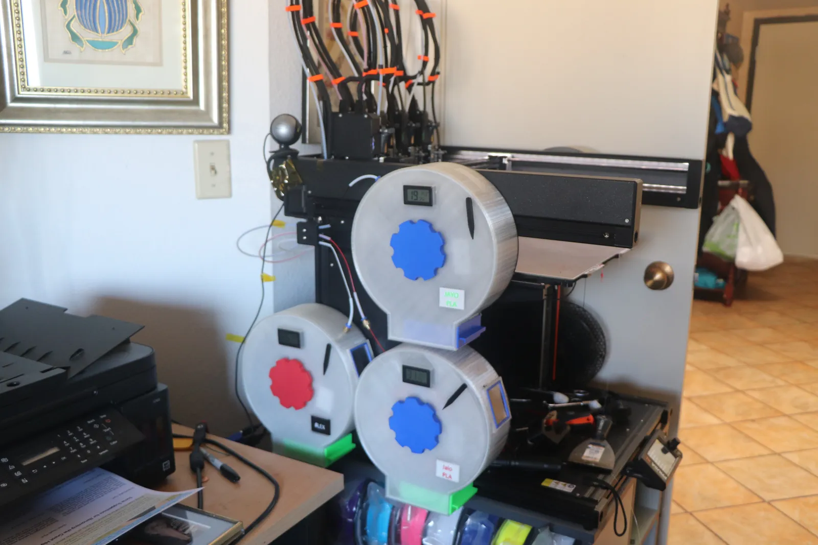 I've got a 2 spool EIBOS filament dryer ontop of our XL that I really kind of hate. The filament ports come out of the middle of the the cover. It's a pain to feed the filament through the hole, then set the roll on the rollers, then get the top on without snarling everything up. Even harder with it sitting about head height over the printer. The bottom of the spools get really warm & the tops not so much. I've made a dry box out of some plastic containers, descant & ptfe tubing before. They end up having the same usability problems as the EIBOS & added hassle of desiccant.