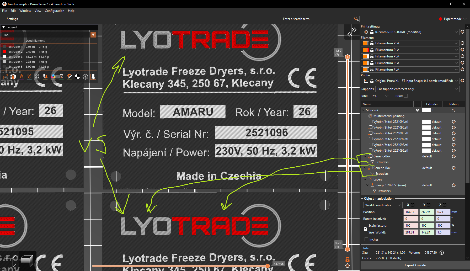 I'm trying to print our production plate with model name, serial number, etc. Until last year, I made it many times with i3MKS with fillament change in PrusaSlicer, as there is no more colors than white plate + black for last 2 layers. This can be simply print with PrusaXL, as there is no issue to set plate (white) with 0,4 mm nozzle and than last 2 layers (black) with 0,25 mm nozzle for better text resolution.