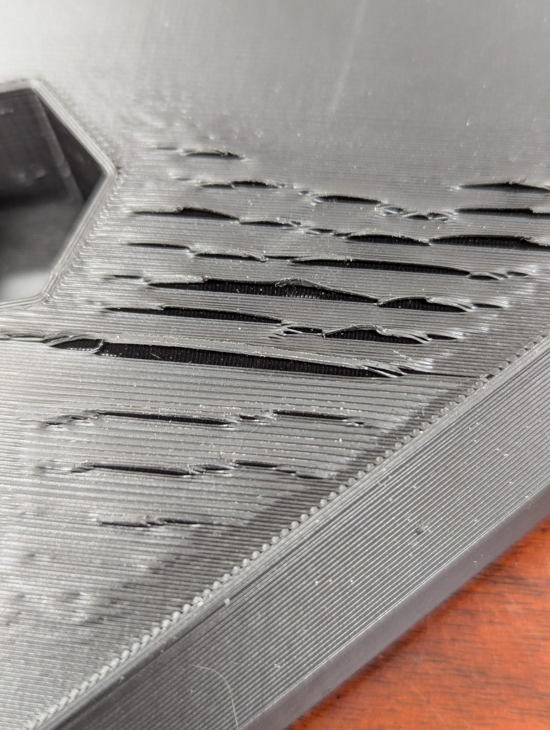 Printing a large rectangular plate which takes up the extents of the 300x300 Core One L bed at a 45° angle. All goes very well (beautiful first layer, clean side walls, clean infill, no material globbing up the nozzle, flawless 1st top layer and subsequent solid infill layers) until the very last layer...here is where this part goes from satisfactory to rejected...