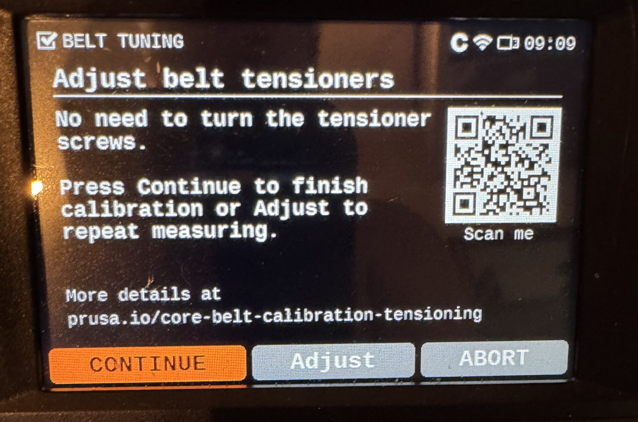 The new Release Candidate firmware 6.4.0 makes belt tuning easier by implementing a wizard and a stroboscope tuner using the built-in white LEDs; no more strumming and acoustic frequency measurements needed. Despite not being officially released, it works ok on the Core One. But with a newly built printer, maybe you want to stick with the production firmware for now.