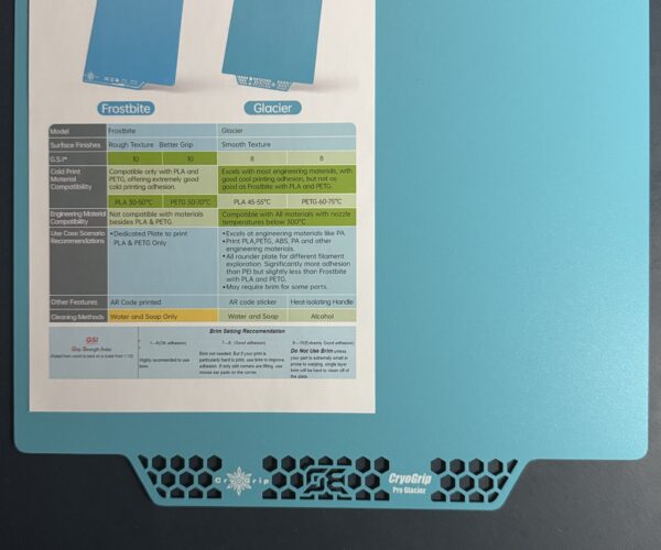 Hello. I just finished some printing tests on the Cryogrip Pro Glacier plate. The bed temperature was set to 45 °C for PLA. I’m wondering if I should also buy a Frostbite plate specifically for PLA and PETG, since those are the materials I use most often.