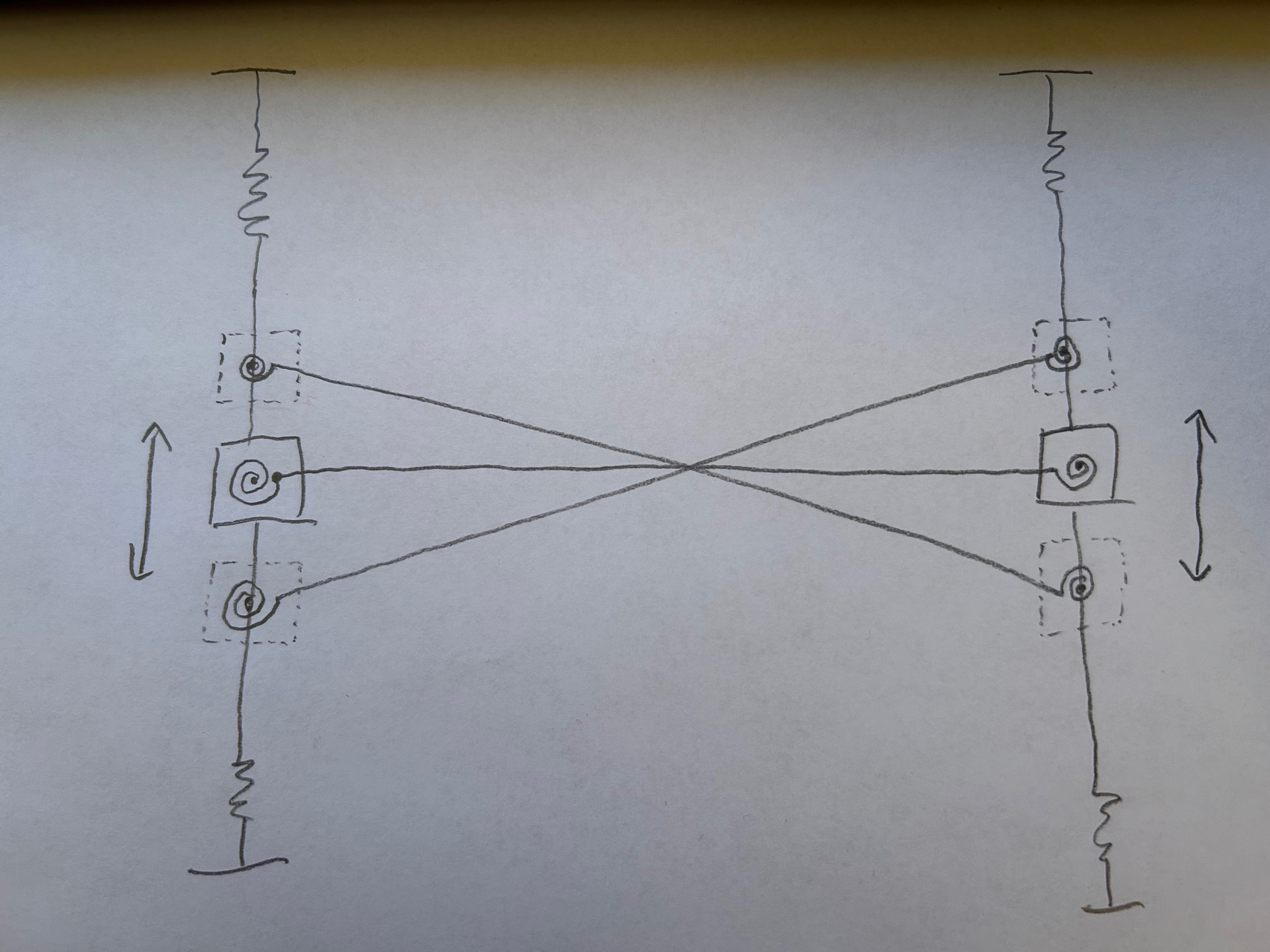If you completely loosen the belts you'll find that there's quite a lot of play in the gantry. The only thing that really seems to be keeping it square is the belt tension itself. So my best guess as to the actual mode is that it's a spring-supported torsional vibration of the gantry itself, rotating about the the vertical axis, as shown below.