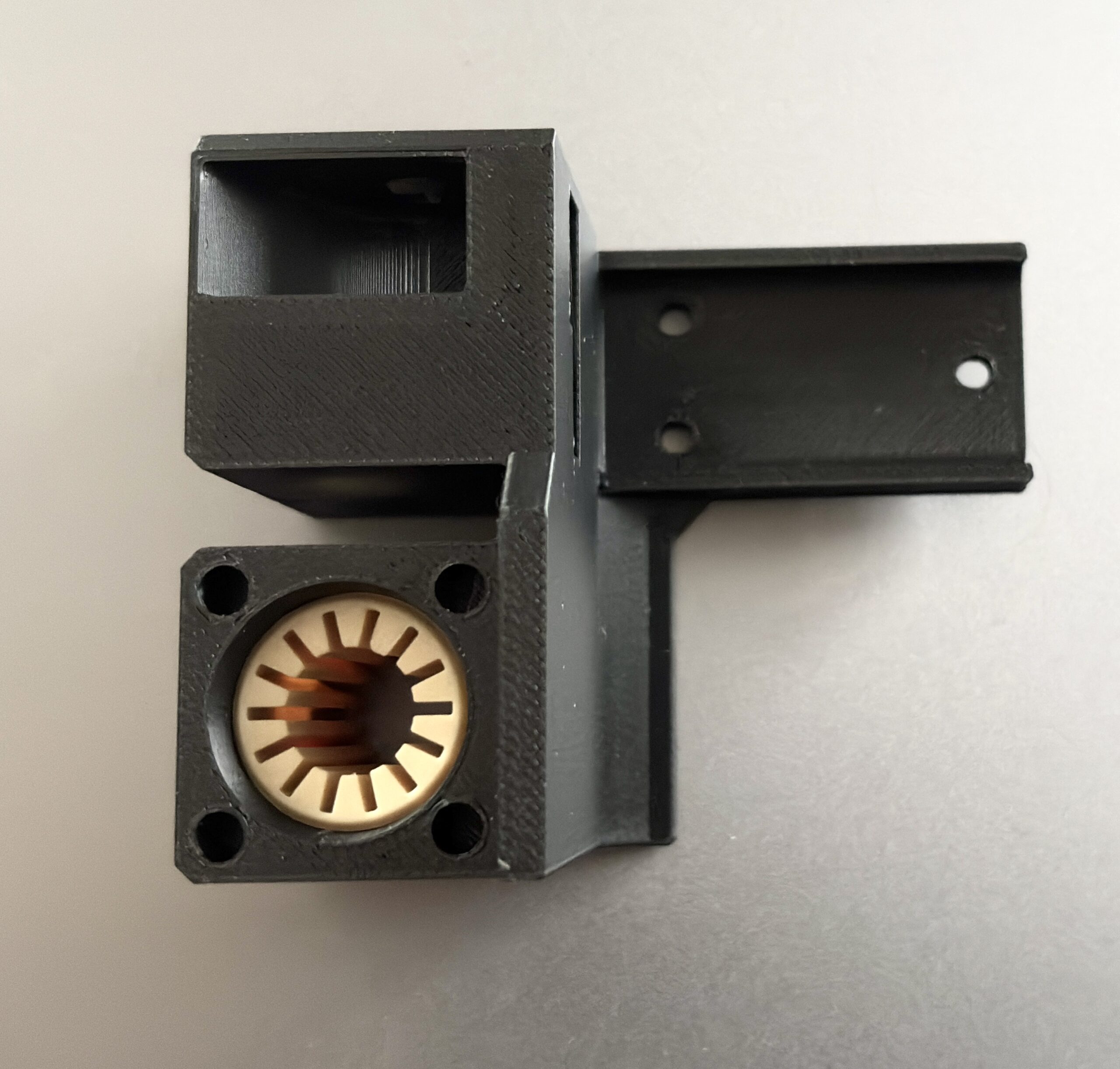 The bearing in the picture is purely for testing dimensions. The PETG is too soft and unstable. Two bearing covers are still missing to prevent the plain bearing from sliding back and forth.