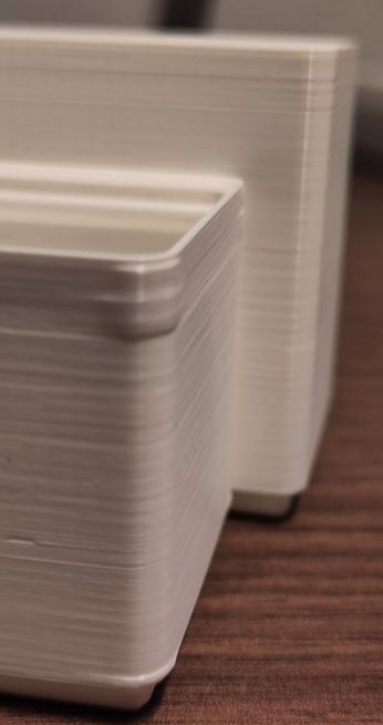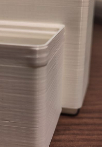Comparing the half finished printed box, to one printed earlier this year it seems not as clean as the old prints. Especially the bottom where the bin widens looks a bit flabby - although quite hard to capture on camera. However, it is of course not the same gcode that is printed. The old example was another shape of the box.