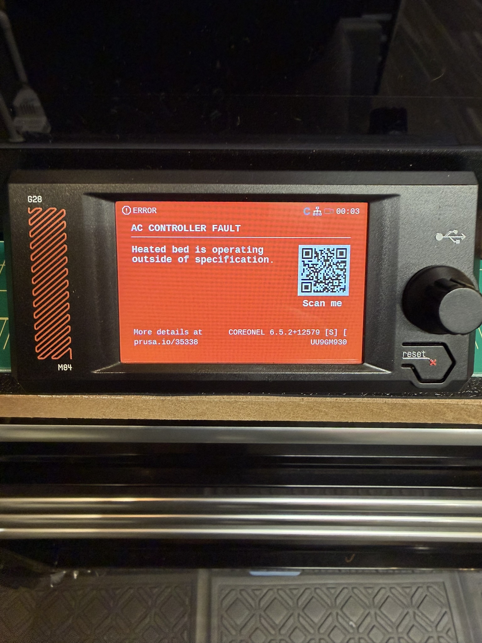 Hey guys, I desperately need some assistance with my core one. I was on support chat last night for about two hours or longer, trying to get this error fixed. We tried downgrading the firmware and then re-upgrading the firmware but every time I turned the printer on, I got the following error. This is the Prusa Core One L. I received it in January of this year, 2026, and I've been printing only with PLA up until this week. Then I tried to print PETG for a bit stronger part and got this error.No matter what I do when I boot up the printer, it goes right into this error. Once the boot-up happens, I do get to see the normal control panel for about 1 second, and then it just shuts off and reboots. I'm in desperate need of help with this, and I've spoken with Prusa via chat, but I haven't heard back from them yet. Is there anybody who can help me with this? I need my printer back up and running, and it is a terrible feeling when you spend this much money on a high-end printer and run into a problem like this.I even read online that having a UPS unit plugged into it to get better sinewave electricity would help, so I ordered one that will be delivered on Thursday, but I still would do anything to get this back to normal printing and reliable. I need to be able to print PLA and PETG, and eventually a few other filament types, with dependability. If anyone out there can help me with this as soon as possible, I would greatly appreciate it. I've been a big fan of Prusa for quite a while, and I've had the MK3, MK4, and the regular Core one. I've sold each one of them to upgrade to the newer version and now have this terrible issue, only a few months in. Please Help Prusa!!!! My printer is currently unusable.