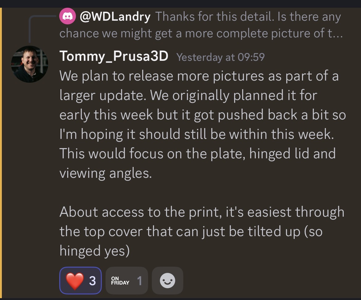 Has Prusa published the detailed photos of the fence and the remaining view of the print today? They were promised on Reddit for "still this week, if all goes to plan", if I recall correctly. Unless Prusa works on weekends, or things did not go to plan, the pictures should be out now?