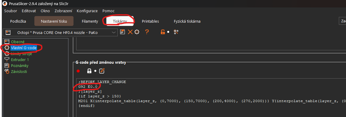 Zdravím, s touto chybou jsem se zatím nesetkal, ale jak píše slicer po otevření starého 3mf souboru klikněte na záložku "Tiskárny" pak vlevo na "Vlastní g-code" a v sekci "Před změnou vrstvy zadejte příkaz "G92 E0.0" viz obr. níže.