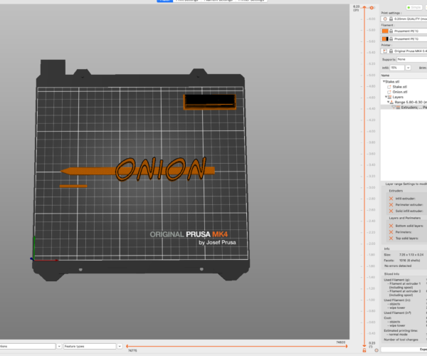 the printer (In this example will print the orange base) when the printer comes to the base of the text, it will request a second colour change, repeat the normal colour change procedure, (Changing to Yellow, in this example) and when the colour is clear, hold onto the wastepile again. and accept the colour change...