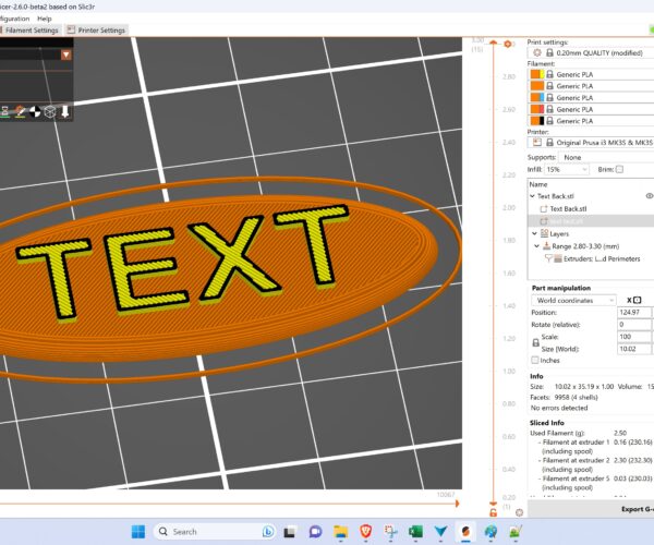 If you want it all to be orange with the Black outline, look in the right hand box, the Text Test element is currently set to the yellow filament, click on the yellow box, a couple of times, and It should offer you a selection of colours, simply select orange .