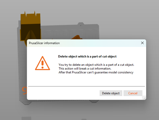 - I received a warning: “Delete object which is part of a cut object”, but proceeded anyway